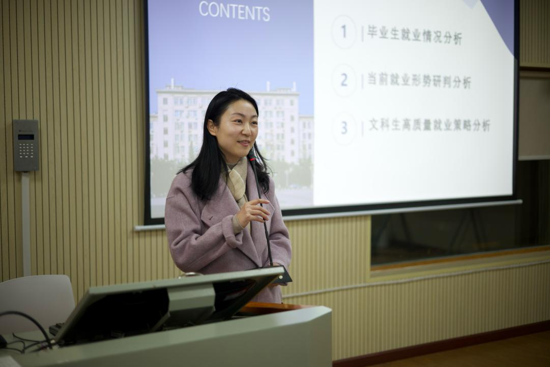 围绕文科生高质量就业策略,她提出了“三重破局”路径:一是打破传统就业观念,树立体制内外多赛道兼顾的主动就业思维,明确“人岗匹配”的底层逻辑与“重价值、重发展”的就业判断标准;二是响应国家战略号召,树立正确就业价值观,主动对接中西部地区、基层治理等国家重点发展领域,同时关注银发经济、数字治理、ESG等新兴赛道,在人才紧缺领域开辟就业新空间;三是打造核心竞争力,强化社会学想象力、社会调查研究、人际沟通等专业优势,做好生涯档案、简历与作品集“三个一”准备。她还提醒同学们避开就业误区,充分利用公司就业实习基地、“社职先锋”课程体系、启航生涯咨询室等资源,提前规划职业发展。