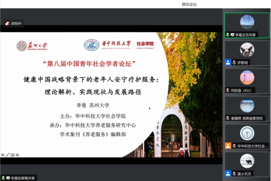 苏州大学讲师李曼以《健康中国战略背景下的老年人安宁疗护服务:理论解析、实践现状与发展路径》为题作报告,对老年人安宁疗护服务发展的必要性以及临终关怀和安宁疗护服务等进行了理论解读。其后,她分阶段对于政策发展现状进行了总结,主要包括完善政策支持体系、保障安宁疗护服务的可及性;规范服务供给、提升安宁疗护服务的可获得性;创造社会氛围、提升安宁疗护服务的可接受性;鼓励个体参与提升安宁疗护服务的有效性。最后,基于服务利用可及性的框架总结了安宁疗护服务的发展路径。