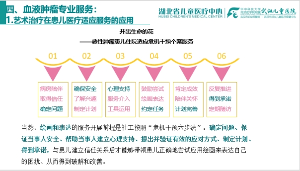 其次,张社工讲解了如何在医院这个特殊场域中开展一线医务社工实务。根据多年的实务工作经验,武汉儿童医院最终确立“立足慢病、大病病区、覆盖全院”的服务模式。医务社工的日常工作,包括开展患者探访与评估、专科查房、医疗适应、心理干预、临终关怀等服务。另外,还精心打造了“为爱捐发”、“澳帝桦新阳光病房公司”、“同心圆之家-武汉儿童医院三峡爱心小屋”等品牌项目。