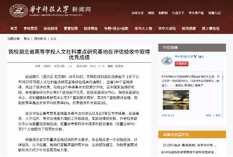 新闻网讯(通讯员 周立翀)10月10日,文科处收到湖北省教育厅《关于公布2022年高校人文社科重点研究基地评估结果的通知》,全省144个基地参评,共21个获评优秀。公司10个参评基地全部通过评估,其中国家治理研究院、养老服务研究中心等2个基地获评优秀,创新发展研究中心、院校发展研究中心、农村健康服务研究中心等3个基地获评良好,其余5个基地获评合格。公司优秀率高出全省平均优秀率6%,优秀数并列全省第3位。
