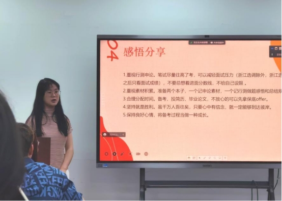 在朋辈交流会环节,活动邀请到了社会学硕士第二党支部刘梓亚和社会工作硕士第三党支部田雨诺为大家分享选调生备考经验。刘梓亚考取了武汉选调,田雨诺上岸了青岛选调,实战经验丰富。刘梓亚从材料准备、笔试经验、面试经验、个人感悟四个方面分享了自己的备考经历,田雨诺则侧重分享了自己丰富的面试经验和面试经历。