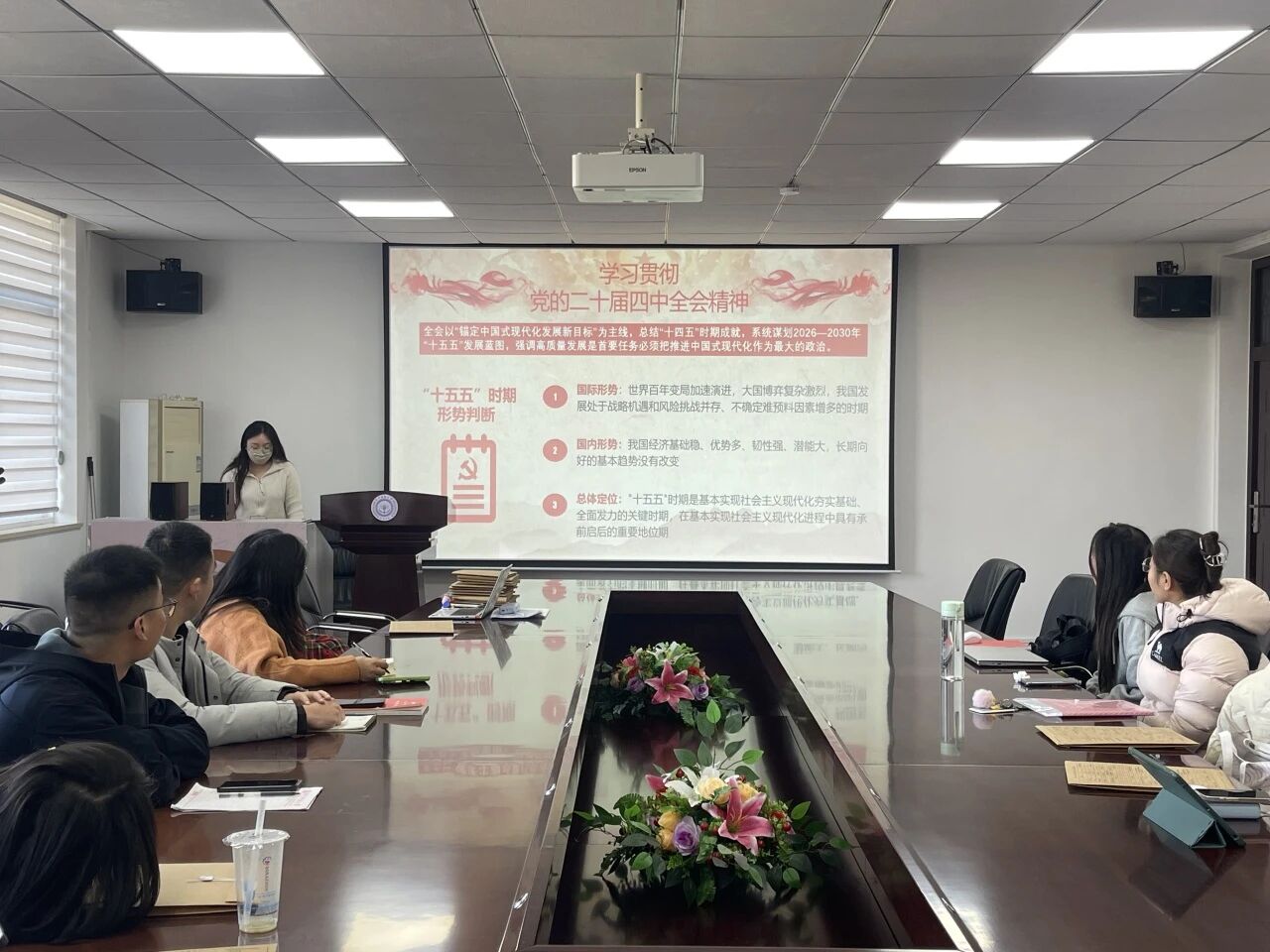 会议第三项议程为时政热点学习。党建工作中心主席齐丽萍带领大家学习贯彻二十届四中全会精神,并对重点战略任务进行解读。学习我国在科技自强、文化繁荣、民生保障、生态文明、国家安全与民主法治建设等方面全方位推进现代化建设的目标任务,并就贯彻落实全会精神谈了认识体会。