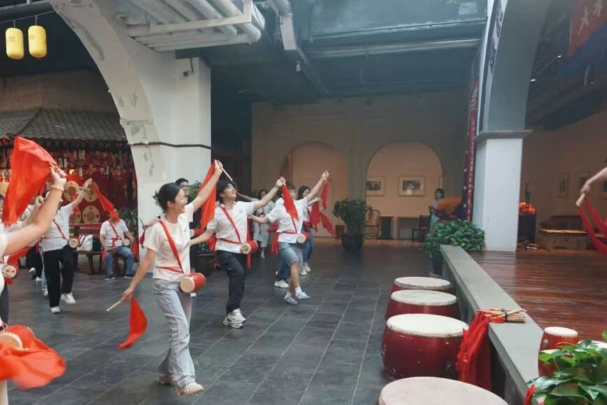 在陕北非遗文化体验环节,师生们在专业人士的教学下,学习了安塞腰鼓的基本动作。在激昂的鼓点、奔放的舞姿中感受陕北民俗文化的生命力,体会革命文化与民间艺术的融合共生。