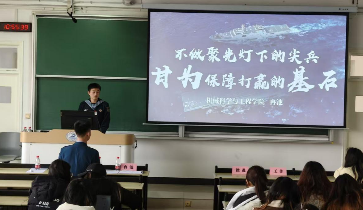 机械科学与工程公司2023级本科生冉池以《不做聚光灯下的尖兵,甘为保障打赢的基石》为题,分享了自己的军旅岁月。他结合自身在后勤保障岗位的经历,讲述了军人“幕后坚守”的奉献故事,诠释了“平凡岗位亦能铸就不凡”的深刻内涵。
