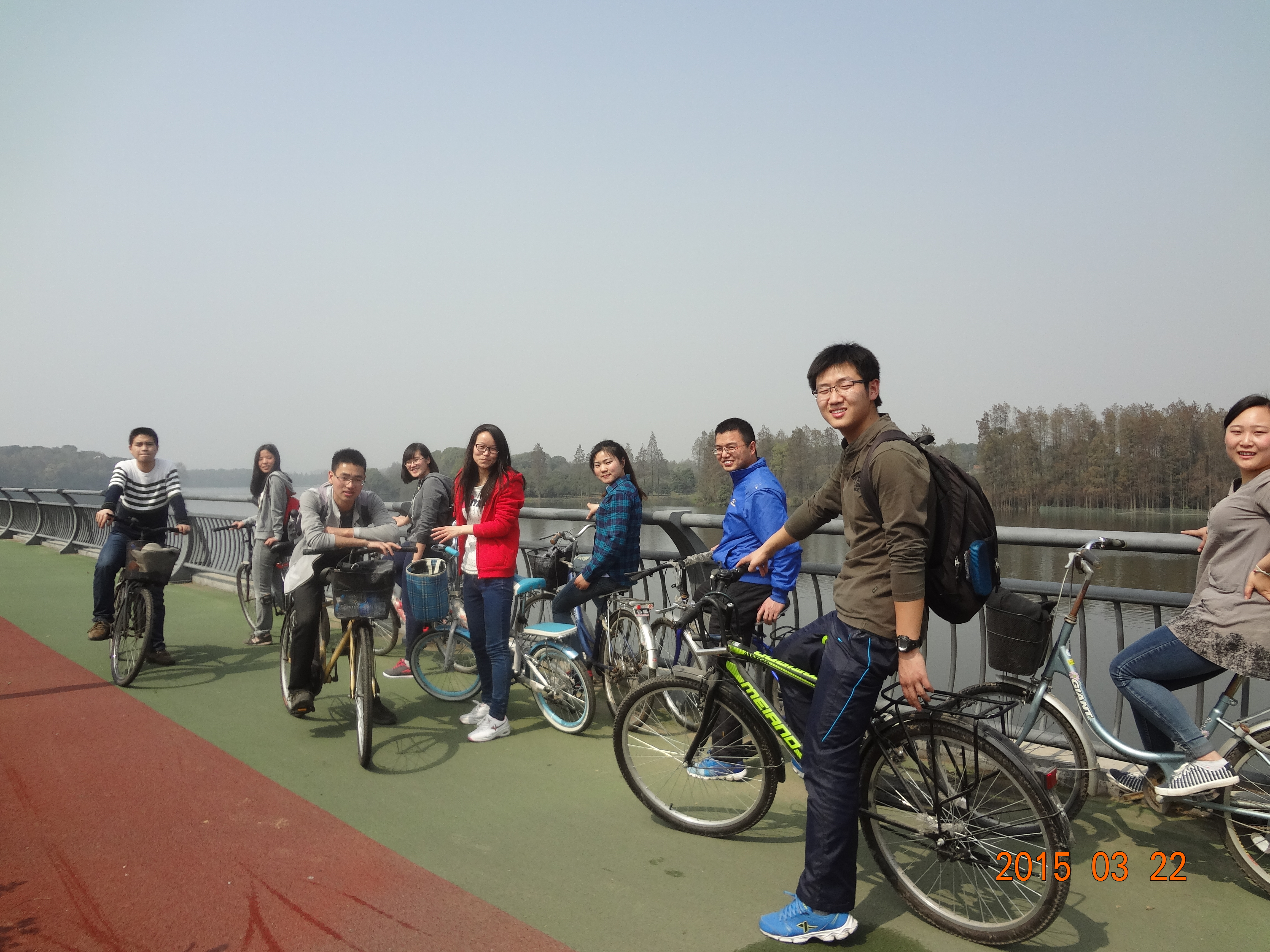 2015年3月21日下午,我系社会学1402班硕士党支部开展了新学期第一次活动。适逢春分和国际森林日,为倡导环境保护、绿色出行,我支部组织了党员同志进行环东湖骑行活动。在落实了自行车租借、路线确认和应急物品购买等准备工作后,党员同志们于下午2点从校东北门出发,沿途经过磨山景区、沙滩浴场、湖北省博物馆等景点,历时4个多小时顺利返回公司。