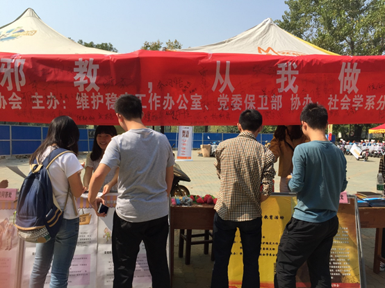 由湖北省反邪教协会指导,betway西汉姆联官方网站党委保卫部、维护稳定工作办公室主办,社会学系分团委承办的反邪教宣传活动于10月18日在紫崧与韵苑成功举办。此次活动以“反对邪教,从我做起”为主题,宣传反邪教的知识。
