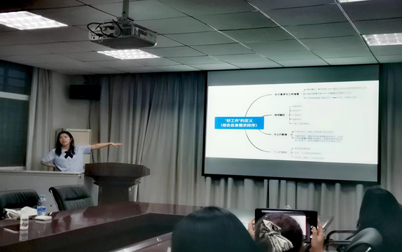 最后一位分享的是谭青青学姐,她的分享可谓是满满干货,运用了三张思维导图详尽地告诉了大家如何找到一份好工作。结合自身的需求去定义适合自己的“好工作”,然后合理确定职业目标,再从校内实践和校外实习两个渠道入手去达成自己的职业目标。