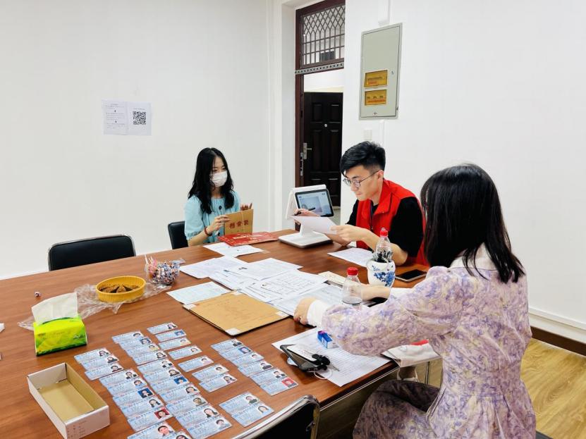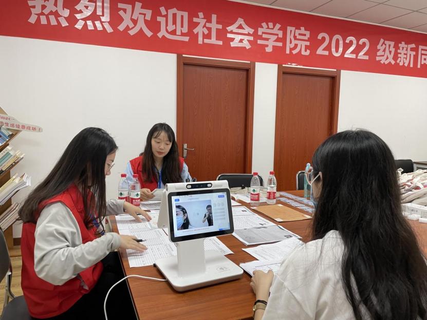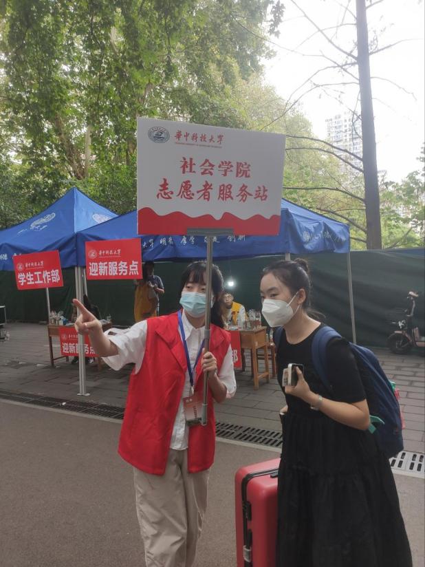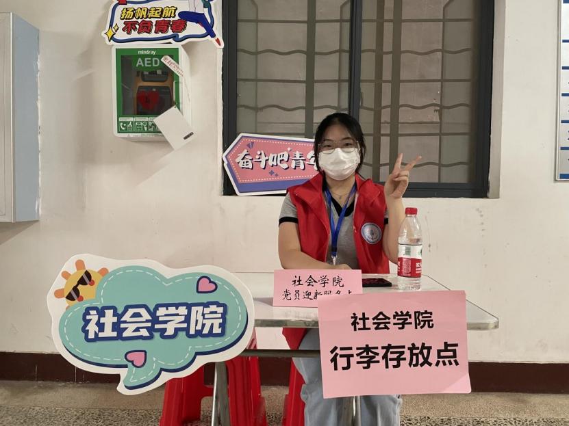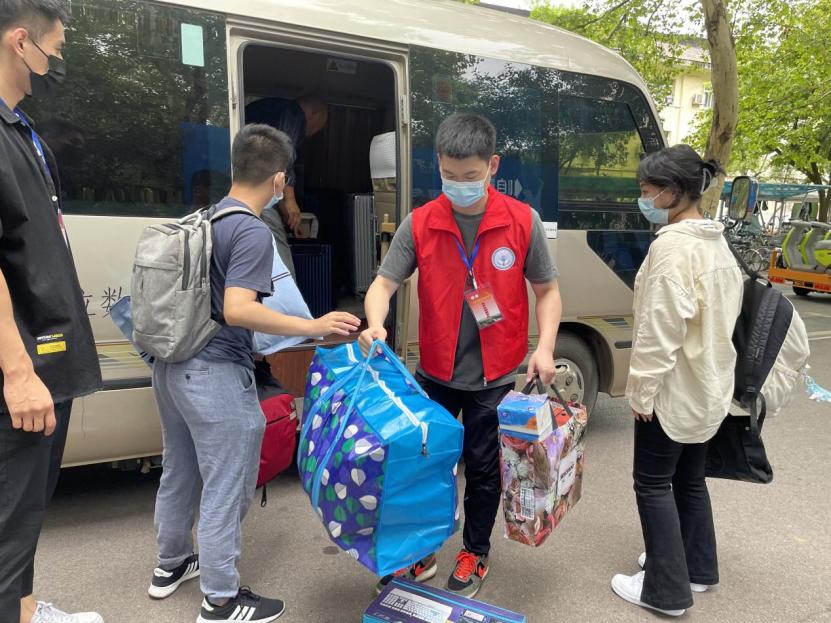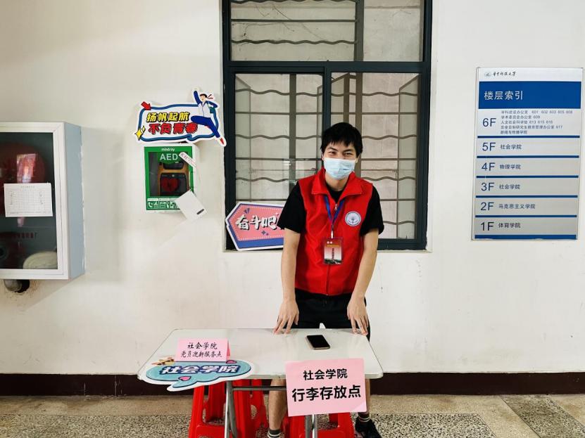 在东九舍迎新点,志愿者陈梁钊和张留欢得知22级社会工作新生张燕涛的大件行李太多,只能暂时寄存在南大门后,主动陪同学妹前往南大门搬运行李,并用电动车将其所有行李送往宿舍,张燕涛说:“志愿者学长太热心了”