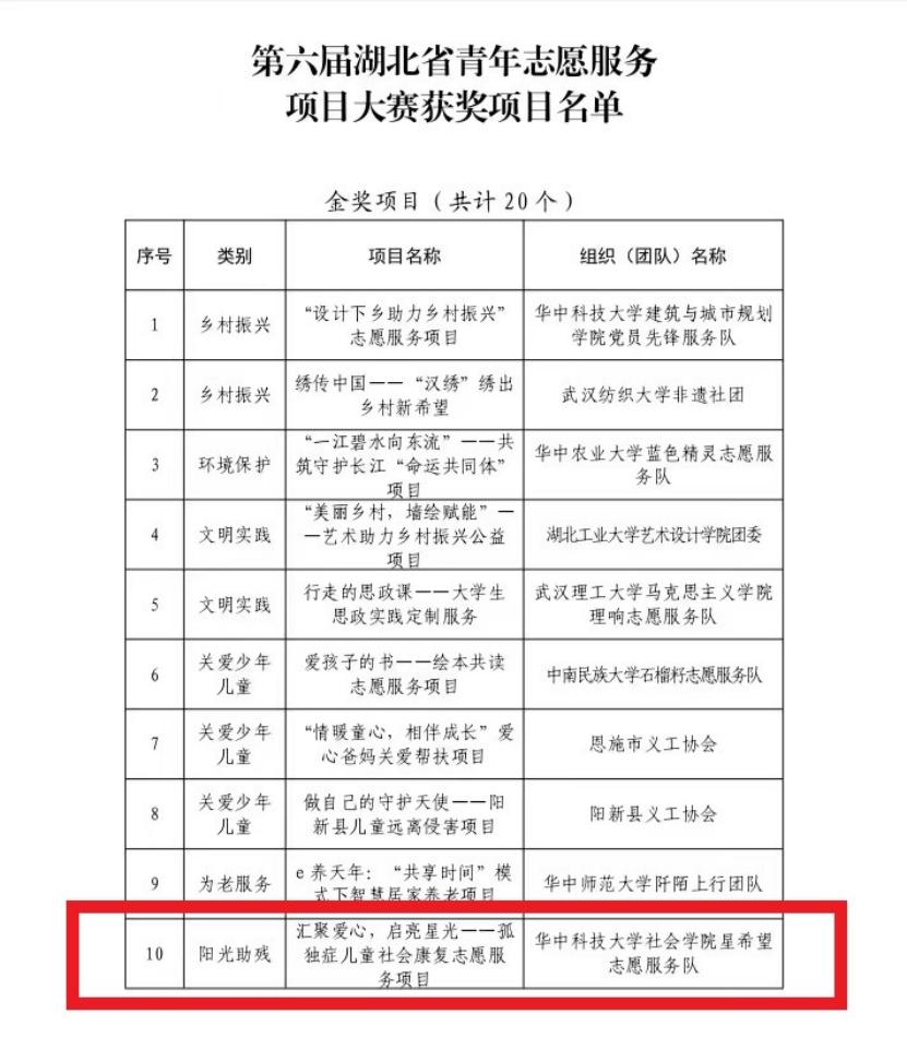 第六届湖北省青年志愿服务项目大赛决赛于9月17日顺利举办。公司“汇聚爱心,启亮星光”——孤独症儿童社会康复志愿服务项目(以下简称项目),在比赛中表现优异、脱颖而出,最终荣获第六届湖北省青年志愿服务项目大赛金奖!