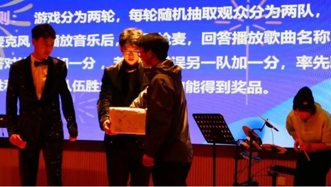 在中场环节我们准备了有趣的互动环节——听歌识曲,考验的可不只是耳朵,还有你的曲库哦。瞧,场上的同学们积极参与,气氛多么热烈。