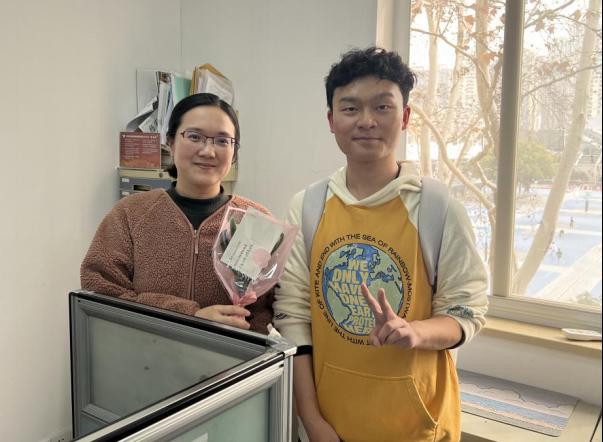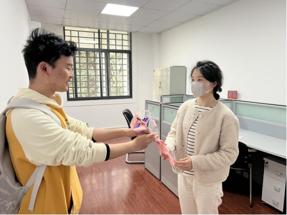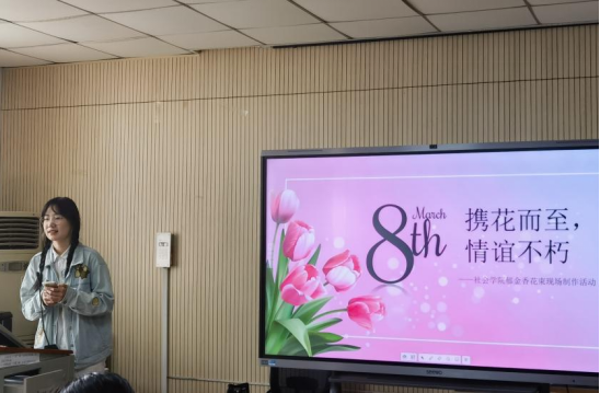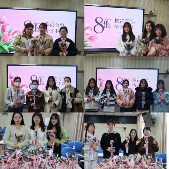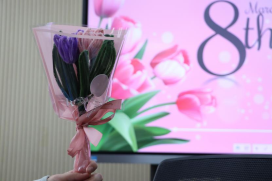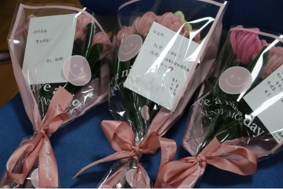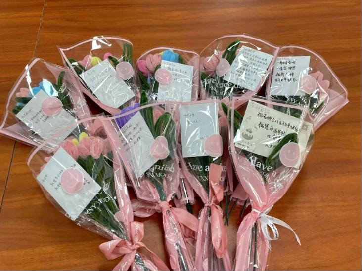 3月7日,同学们制作的花束被送到了公司女性教师们的手中。
