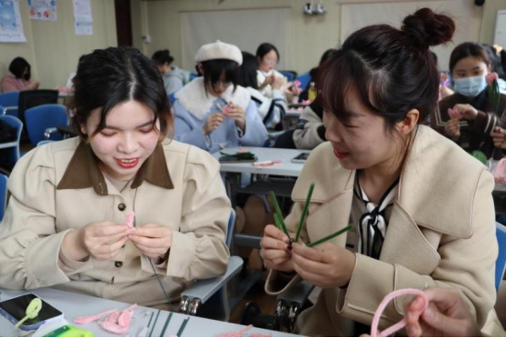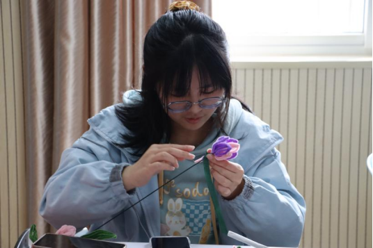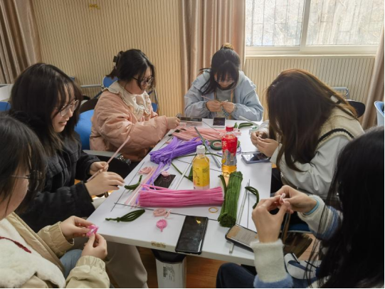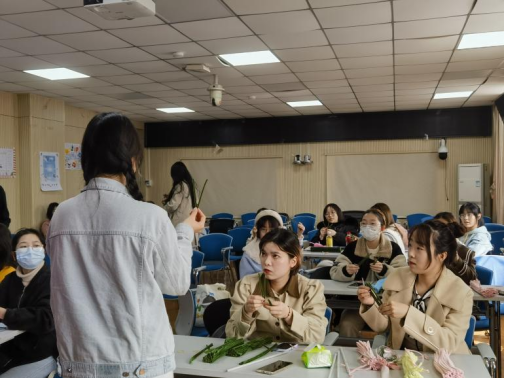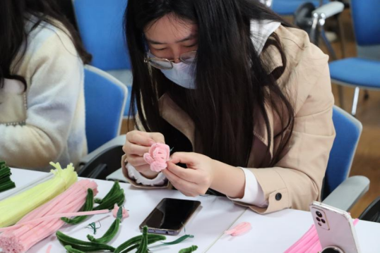 怀着对女性教师们的尊重与感谢,同学们都专心致志,不时向同组同学或工作人员寻求帮助。活动现场氛围轻松,大家友好交流,团结互助,共同完成了郁金香花朵的制作。