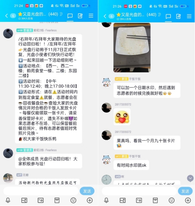 2022年10月,团委实践部与多院合办开展“勤俭华中大”光盘打卡活动。“勤俭华中大”系列活动在帮助同学们养成勤俭节约的良好习惯的同时,也增进了betway西汉姆联官方网站同学之间以及同学与老师之间的情谊,反馈良好。
