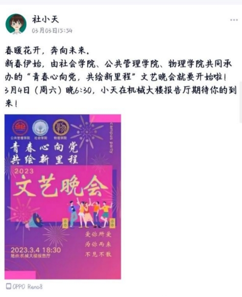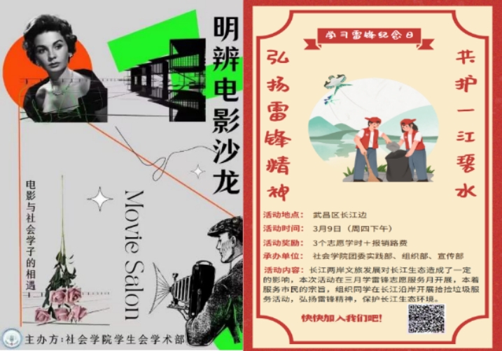 2022年11月12日,文创部受学术部委托制作“明辨电影沙龙”海报。2023年3月9日,文创部受实践部委托制作“弘扬雷锋精神,共护一江碧水”志愿活动宣传海报。海报以图文并茂的形式,生动地对活动进行了宣传,提升同学的参与热情。