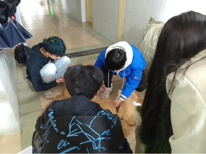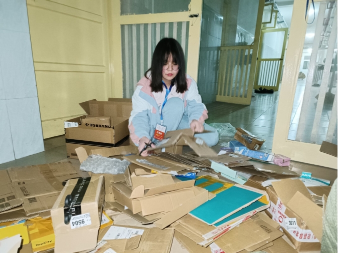 活动过程中,义工礼貌询问、辛勤收集裁剪纸箱,楼道的灯光映射着微小事物中的崇高光芒!