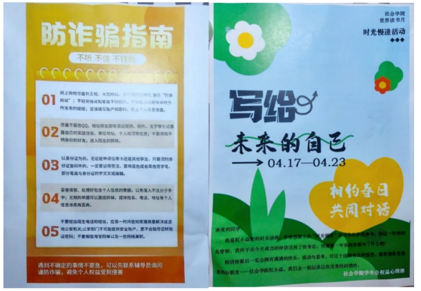 4月15日晚,权益心理部的成员依次敲开betway西汉姆联官方网站每个寝室的门,与同学们进行交流,提醒大家谨防网络诈骗,建议认真观看海报上的防诈骗指南,帮助同学们提高防诈骗意识。接着,成员们检查了每个寝室的地面卫生,杂物堆放以及电器的使用情况。同时,部员们为上学期参加时光慢递活动的同学带去了一年前自己写的信,并向同学们宣传了今年的时光慢递活动,解答大家关于活动开始时间、参与方式的疑问。最后,他们为同学们送上了精心准备的糖果和小礼物。
