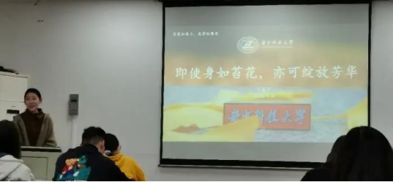 另一位自强老员工标兵得主林洁文同学则以“心怀热爱,奔赴山海”为题,与我们分享了她志愿服务的故事。她分享了志愿服务这颗种子是如何在她内心生根发芽的,她也通过一张张真实且美好的图片向我们展示了她是如何通过投身于校内外的各种志愿服务活动(小到校内的爱心义卖、青春舞会等,大到国家级的《湿地公约》缔约大会志愿服务活动)不断浇灌这颗志愿服务的种子并使之茁壮成长为参天大树的。她在一次次的志愿服务活动中体会“奉献、友爱、互助、进步”的志愿者精神内涵,感受服务他人、服务社会的乐趣。正如林洁文同学所言:“在自立自强中、在服务他人、奉献社会中收获成长和进步,让青春在火热实践中绽放绚丽之花。”她的这份赤忱初心与无私热爱感染着每一个人,也激励着我们向她学习,坚持自立自强与无私奉献。