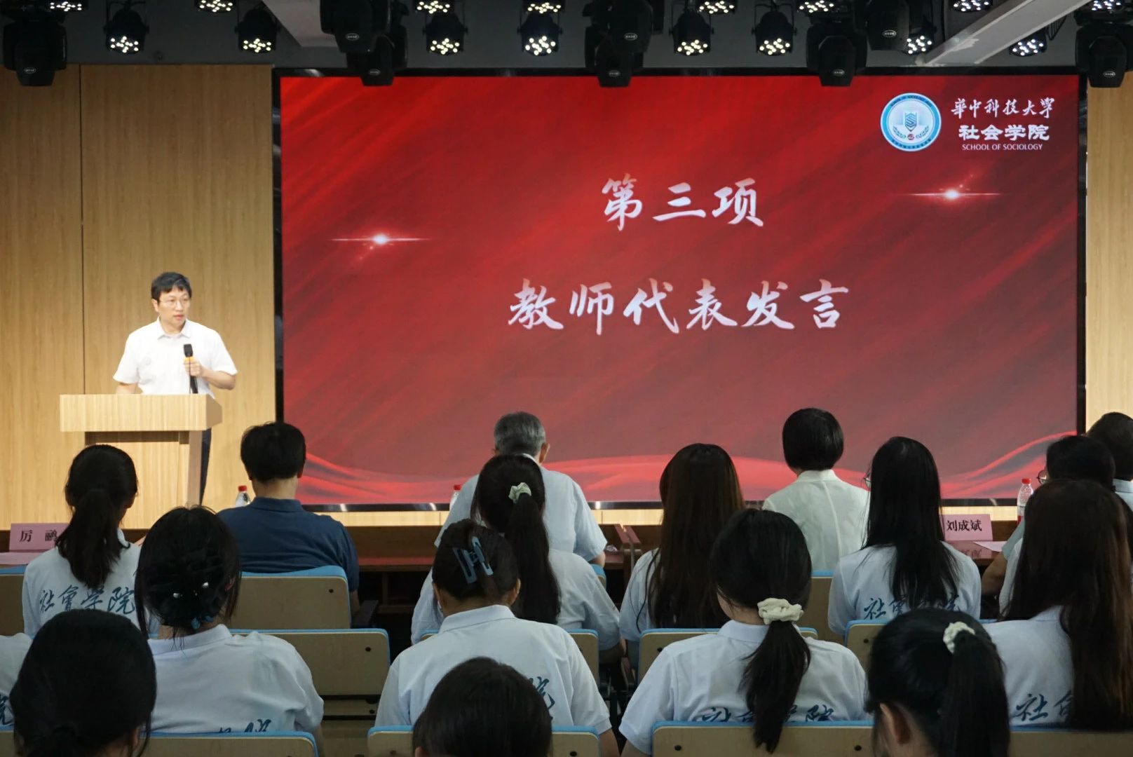 研究生老生代表,2023级社会学硕士朱乘慧从自我的学习经历出发,向大家分享了他在华科修习的“三堂课”。即在课堂上博闻广识,不懈求索;在田野里躬行实践,领悟社会真谛;在研究中承前人之所悟,感群众之所感,知社会之所在。他寄望新生们“拥有鲜活的热忱和勇气,保持浓烈的好奇与求知欲,从实求知,胸怀家国,笃学力行,善世正心”。