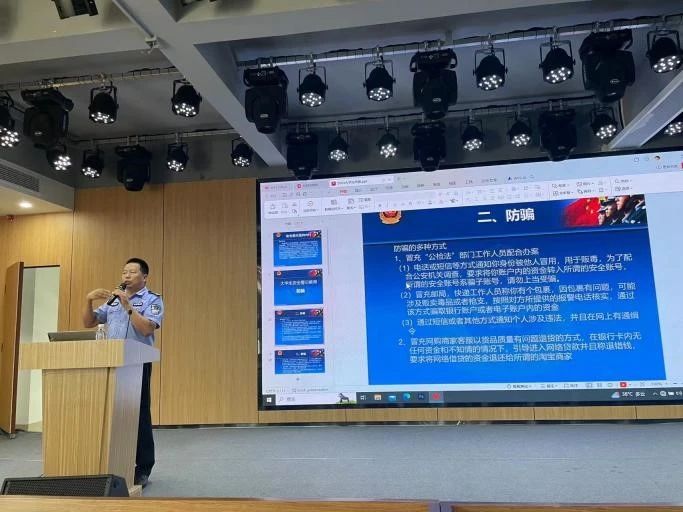 9月2日下午,喻家山派出所的熊警官上了一堂精彩的校园安全教育课。为提高新生的防骗防盗意识,他介绍了几起发生在校园中的真实案件,并播放相关监控录像。他告诫大家不要轻信陌生人,保管好个人财物,切勿投机取巧。最后,同学们纷纷拿起手机,存下24小时报警电话,新生入学教育在一片轻松诙谐的氛围中结束。