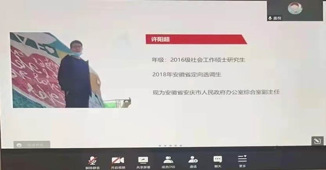 第三位为我们分享的是来自社会工作专业的2016级硕士研究生许阳超,为安徽省2018年定向选调生,现为安徽省安庆市人民政府办公室综合室副主任。阳超学长细致地与我们分享了他的备考心得,说到下基层挂职锻炼他深有体会,也为我们介绍了一些他工作中的细节,让我们真实地感受到了选调这条道路上的艰辛与付出。