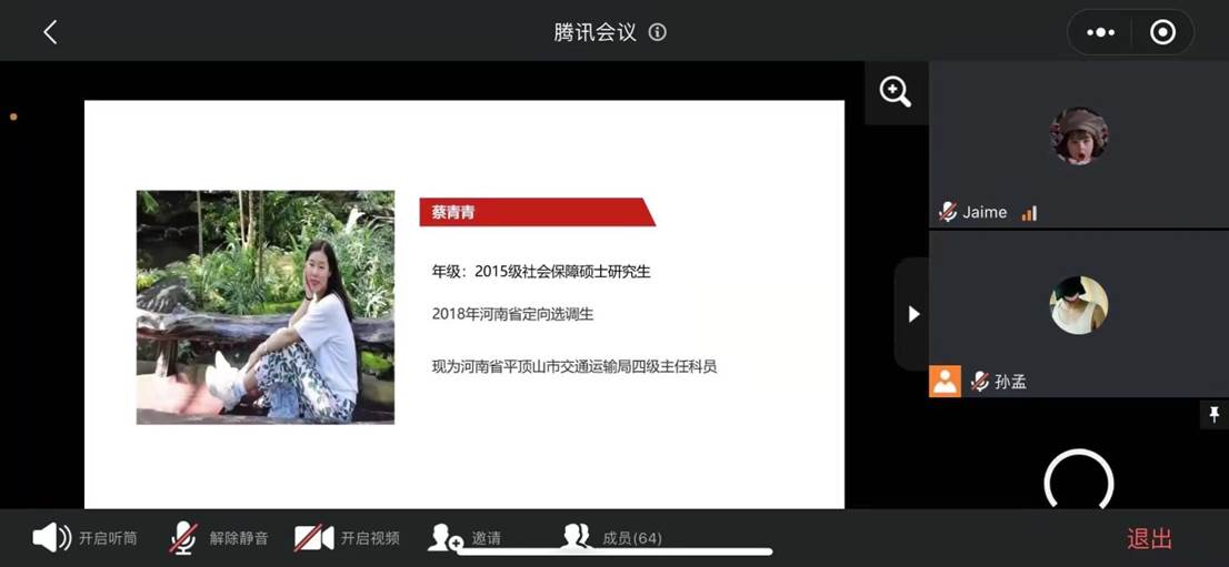 一位嘉宾是来自社会保障专业2015级的毕业生蔡青青,为河南省2018年定向选调生,现为河南省平顶山市交通运输局四级主任科员,她为我们具体讲解了河南省的选调政策,并且分享了入职之后的生活。最后她寄语学弟学妹们:练好内功、提升修养、增强本领,努力成为可堪大用、能担重任的栋梁之才!
