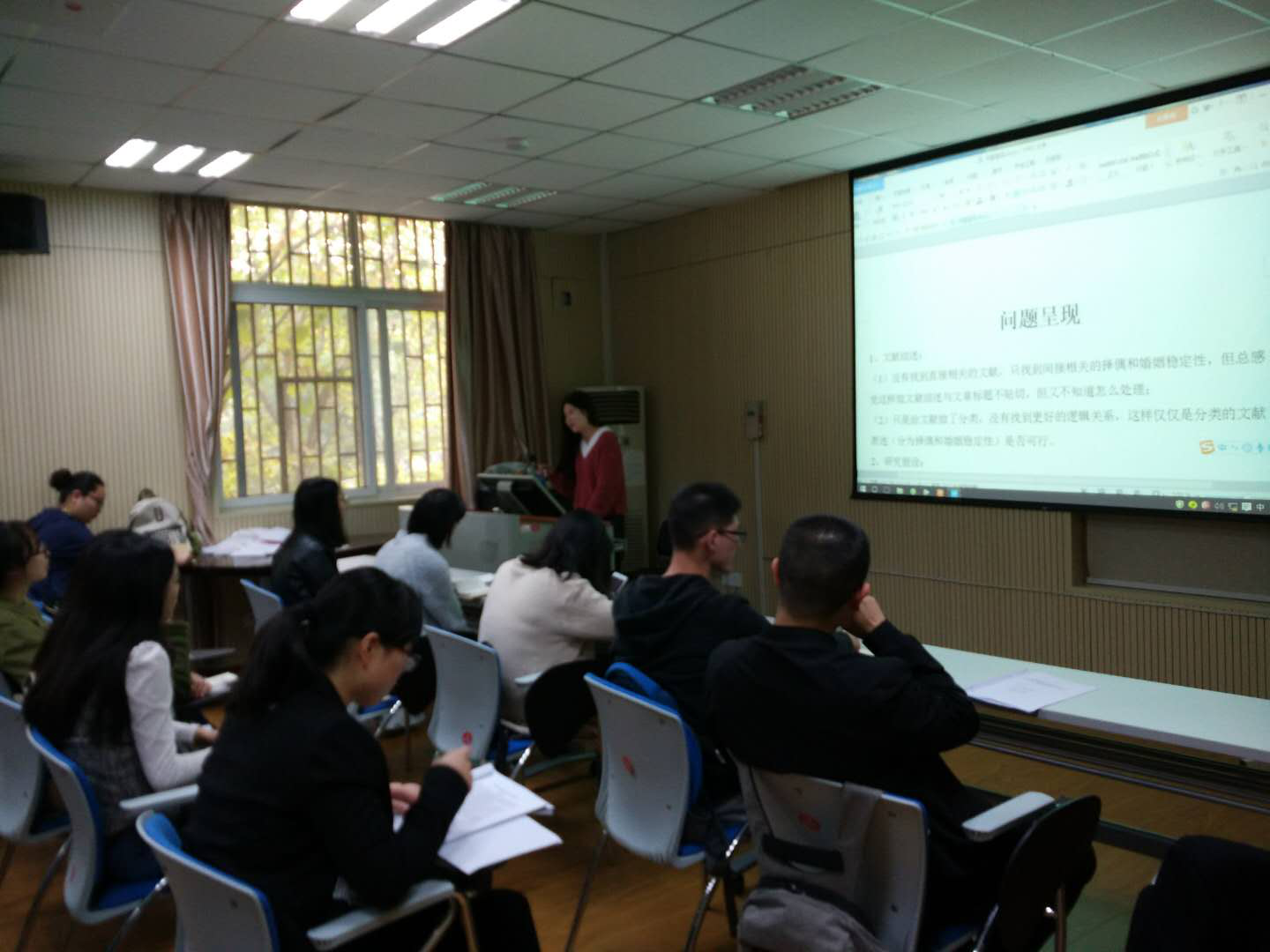 3. 优秀员工发挥榜样作用。本学期课程于10月17日和11月7日分别邀请了两位高年级同学曾福星和张应阳进课堂分享他们的研究成果。这种做法除了贯彻案例教学的思路,针对具体的研究解析实际研究过程中可能遇到的问题及解决问题,更重要的是,可以帮助员工树立学术信心。