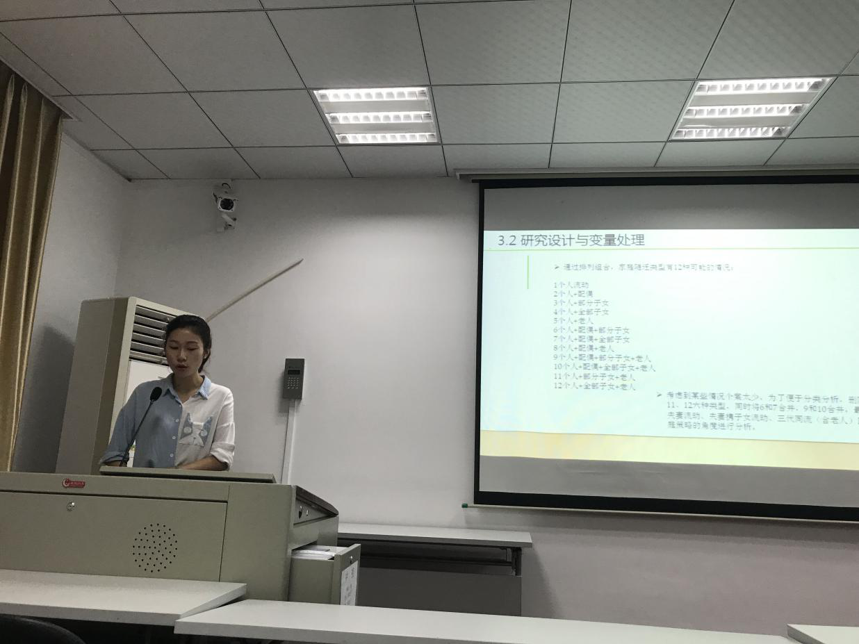 活动开场,主持人表达了对指导老师和同学们的问候及感谢,并对点评老师和主讲人进行简要介绍。其中,石老师就“喻晨学术沙龙”活动举办以来取得的成效表示衷心的祝贺,并对在座硕博生寄予厚望。随后,主持人邀请点评嘉宾为新一届喻晨学术沙龙联络处成员颁发聘书。在优秀论文代表曾福星同学的精彩发言后,2017级沙龙交流正式开始。向丽君的主讲题目是《家庭策略视角下随迁类型对农民工城市定居可能性的影响研究》。论文通过五大板块进行展示,分别从研究缘起、文献回顾、研究数据、流动农民工结构性特征和总结一一介绍。