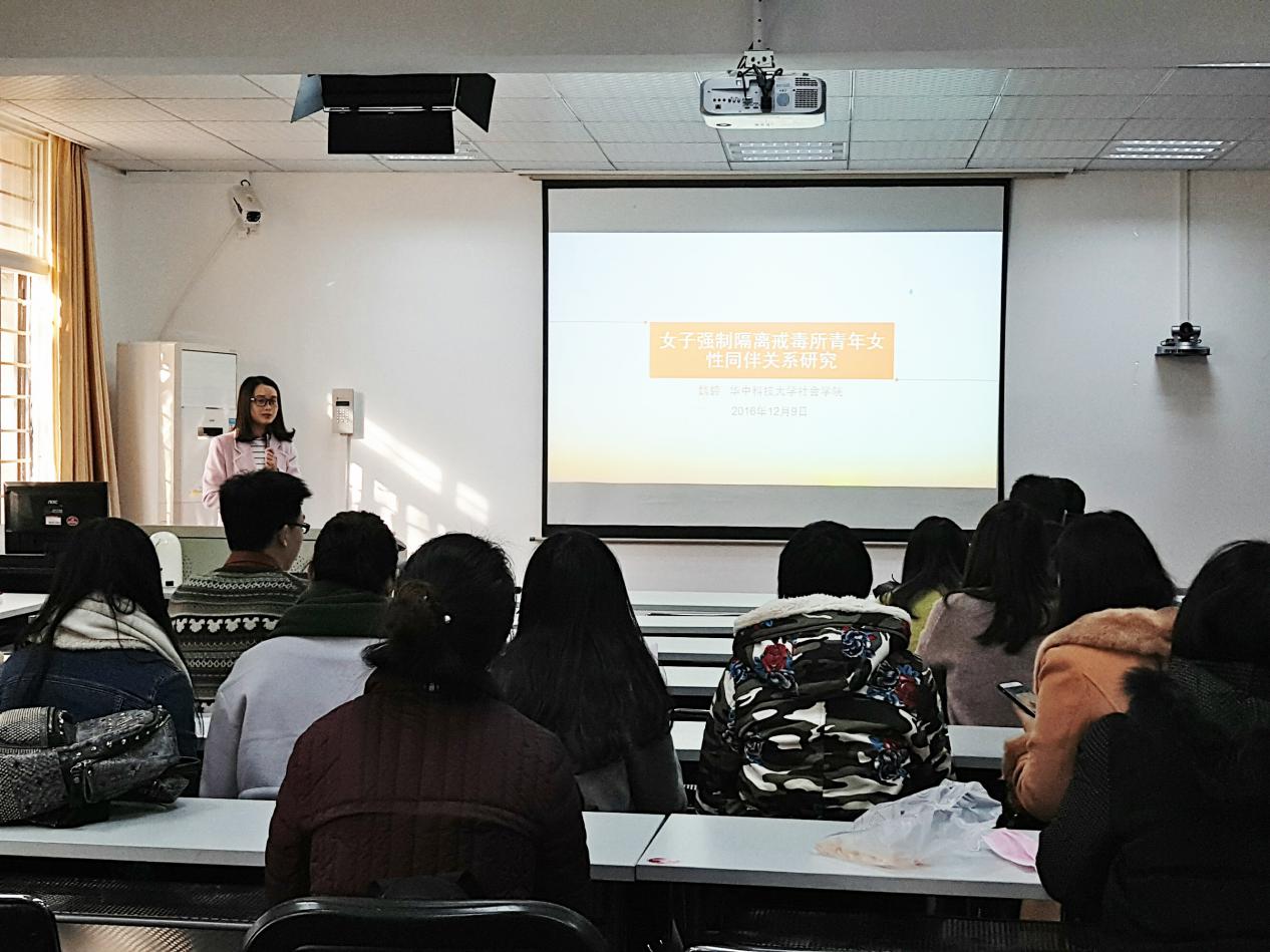 活动开场,主持人表达了对到场老师和同学的问候和感谢。在对点评老师和主讲人进行简要介绍后,魏碧开始用PPT与大家分享她的这篇文章。魏碧首先对吸毒人群的主要特征进行了一个简要的介绍,使得大家对这一特殊群体有了一个初步的了解。接下来她主要从问题提出、研究方法、研究发现及讨论这四个方面对其论文进行了分享。魏碧提到,这篇文章是基于对11位女性强制隔离戒毒学员的访谈记录、个人档案和事件经过的总结研究,结合强制隔离戒毒所管理制度,来分析女子强制隔离戒毒所内学员同伴关系表现形式和原因。研究发现,女子强制隔离戒毒所内学员同伴关系主要呈现出同伴管理、同伴矛盾、同伴互助这三类。同时,文章从戒毒所管理需求和学员需求两方面进行了分析,并在此基础上对戒毒所的管理制度提出了自己的中肯意见。随后,2016级社会工作专业硕士田璐在文章的研究目标及访谈对象的选取标准上提出了自己的问题;2015级社会保障专业硕士生高翔提出研究的问题意识不够,冲击力不强等看法,并对文章的写作规范上提出了自己的建议。主讲人魏碧也分别对同学们的问题和意见做出了相应的回应。