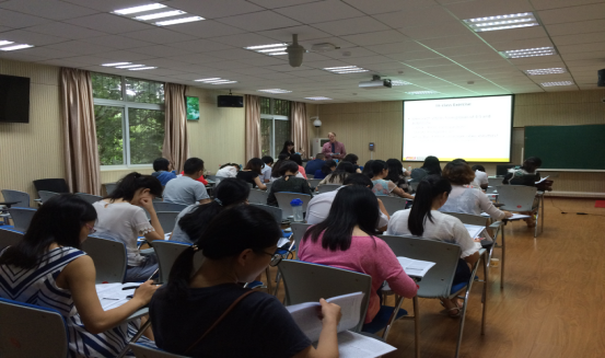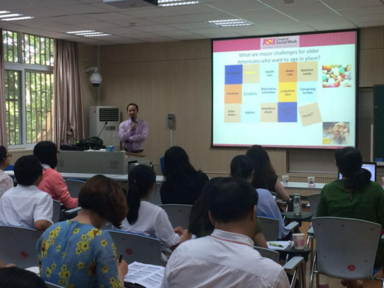 此次培训为期四天,课程设计主要包括社会工作研究方法、项目设计和评估以及系列工作坊。前两天的培训是由David R. Hodge和Barbara Klimek主持。David R. Hodge主讲的是社会工作研究方法,他用幽默风趣的教学方式吸引了学员的高度关注,同时他的课程中还穿插着游戏的形式,这样的教学方式让培训者都受益匪浅。Barbara Klimek的课程是项目设计与评估,在课堂上她邀请大家进行自我介绍,每位学员都积极主动的参加,并与教授互动。其他三位教授的培训都是以工作坊的形式进行,主题分别为美国老年政策和社会服务体系、美国老年人照料服务模式、对老年痴呆家庭照料者的服务,在分组讨论中大家积极热烈讨论,彼此分享各自的观点和想法。培训现场学员热情高涨,与教授积极交流互动。