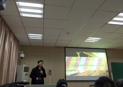会议第二项是由挑战杯获奖代表陈伟同学发言。他在发言过程中提到了三点:团队的重要性,对资源的挖掘,和自我的坚持。在他看来,挑战杯历时将近两年,在这个过程中,坚持显得尤为重要。在其发言中,陈伟同学也反复提到了一句话:“欲戴王冠,必承其重”,希望借此能够勉励14、15级的学弟学妹。