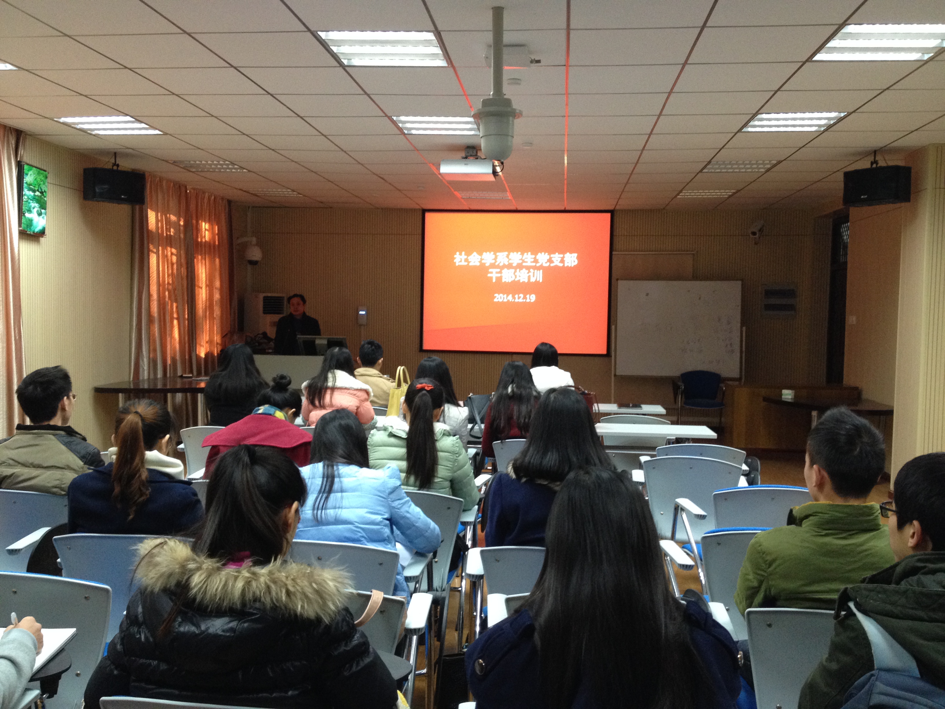 2014年12月19日下午2:30,社会学系员工党支委干部培训第一讲在东七楼社会学工作实验室举行。此次培训由社会学系党总支书记高顺文主讲,社会学系党总支副书记彭剑钊、党建辅导员曾娟,辅导员曾福星与本、硕、博各员工党支委成员一起参加培训。