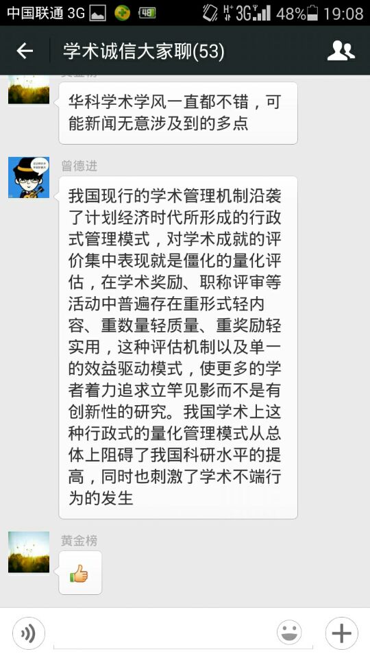 微信作为一种社交平台,既方便网络交流,也方便学习。社会学系研会充分利用微信这一新媒体平台,在大家闲余之时,新建“学术诚信大家聊”微信群,发动全系研究生参与此次群聊活动。我系研究生于11月16日晚上七点到八点间,积极参与此次“学术诚信大家聊”活动,并邀请其他院系同学参与。有同学就学术不端产生的原因或对策进行分析,也有的同学就群主提供的学术不端案例材料发表自己见解,观点或新颖独特,或真切深刻,在短短一个多小时内,大家借助微信群聊这一公共平台,发表自己对学术诚信的真切感受,有效的加深了我们研究生对诚信的理解,对学术的追求。