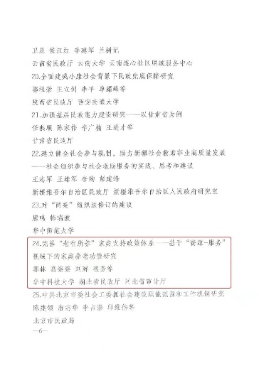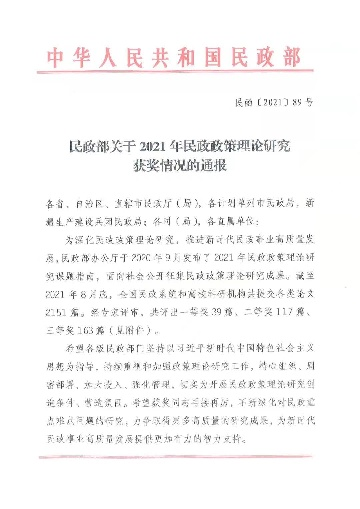 11月26日,民政部印发的《民政部关于2021年民政政策理论研究获奖情况的通报》(民函〔2021〕89号),公司郭林、高姿姿与湖北省民政厅的成果《“老有所养”家庭支持政策体系的完善——基于“资源-服务”视域下的家庭养老功能研究》,荣获部级一等奖。