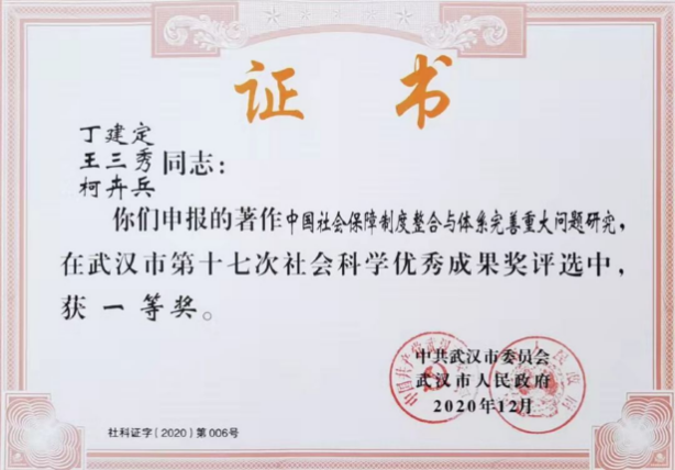 4月,武汉市第十七次社会科学优秀成果奖揭晓,丁建定教授及其团队的成果《中国社会保障制度整合与体系完善重大问题研究》荣获一等奖。