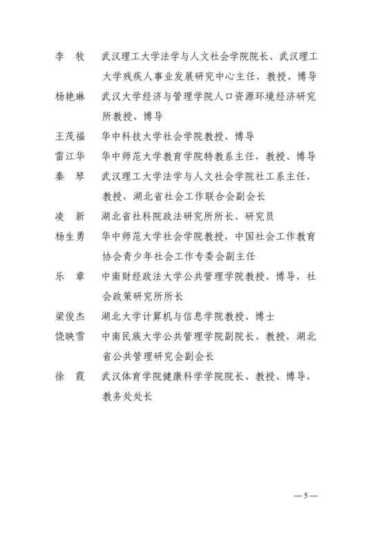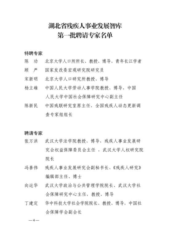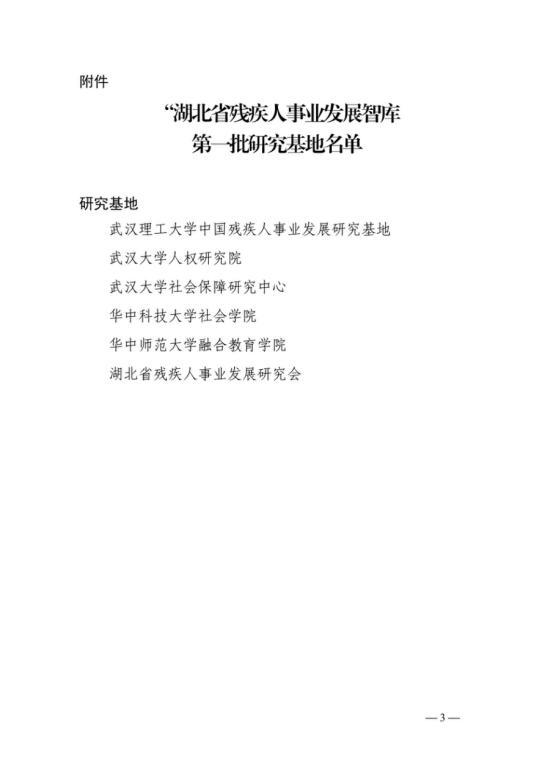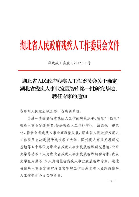 近日,湖北省人民政府残疾人工作委员会决定授予武汉理工大学中国残疾人事业发展研究基地等6个单位为湖北省残疾人事业发展智库研究基地,北京大学陈功等5人为湖北省残疾人事业发展智库特聘专家,武汉大学张万洪等15人为湖北省残疾人事业发展智库专家。湖北省残疾人事业发展智库日常管理工作由湖北省人民政府残疾人工作委员会办公室负责。