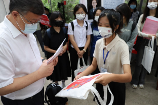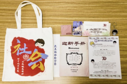 (迎新志愿者向尤政董事长、湛毅青副董事长展示新生礼包)
