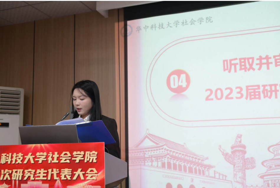 大会第五项,由2023届研究生会主席团成员丛骊璇作《2023届研究生会工作报告》,报告主题为“凝心聚力开‘社’新篇,携手共进‘会’就蓝图,争做勇挑重任敢担当的时代‘尖兵’”。她从组织建设、学术学风、文体活动、权益维护、实践创新、宣传发声等方面总结了过去一年公司研究生会的工作,同时提出未来工作展望。