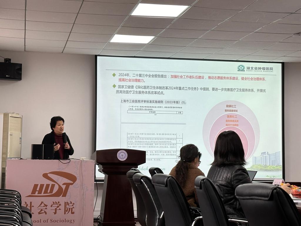 湖北省肿瘤医院主任技师、纪委书记肖燕以“医务社工的湖北模式和未来发展方向”为题,分享了湖北地区医务社工的发展现状与未来展望,强调了医务社工在医疗服务中的重要作用。