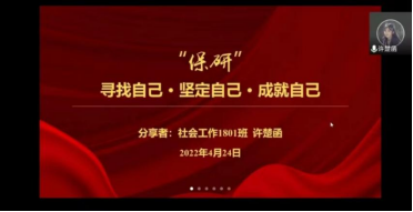 2022年4月24日下午,betway西汉姆联官方网站优秀学长学姐分享会第一弹——保研分享会顺利举办。因疫情防控需要,此次分享会采用线上腾讯会议的形式,本科生辅导员岐尚鲜参加了本次分享会。分享会上学姐们倾囊相授,同学们受益匪浅。