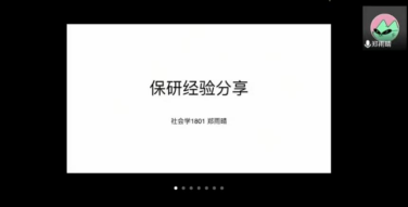 随后进行分享的是社会学1801班的郑雨晴,她从保研的时间线和各个阶段的准备事项展开,就个人陈述和推荐信的填写给出自己的建议。她提到,唯有找准自身定位,广泛涉及学科各领域并发现自己的兴趣所在,才能在学术研究路上行稳致远。