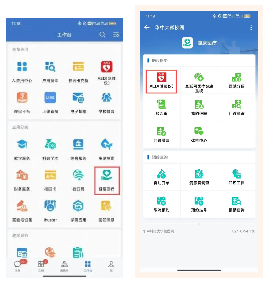 打开“企业微信”→点击“工作台”→点击“健康医疗”→选择“AED(除颤仪)” →查看具体位置