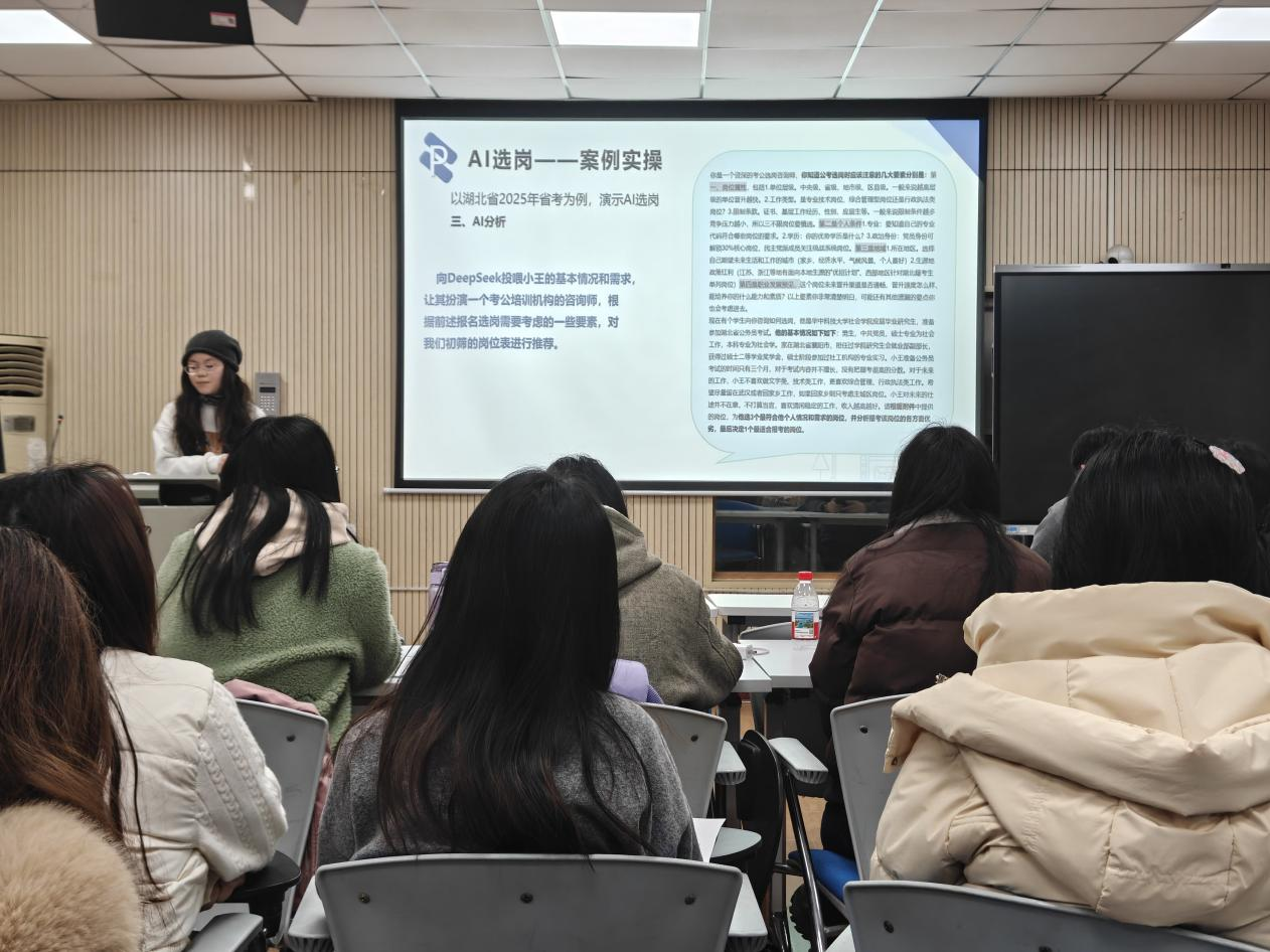 与此同时,DeepSeek专题培训工作坊在主讲人李叶欣的带领下,开启了一场AI助力求职的探索之旅。工作坊聚焦DeepSeek在考公选岗、备考辅导、简历润色、自我介绍定制、面试模拟五大核心场景的应用,为同学们展示了智能化求职的全新可能。