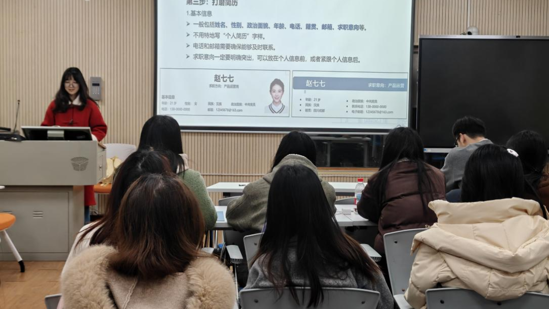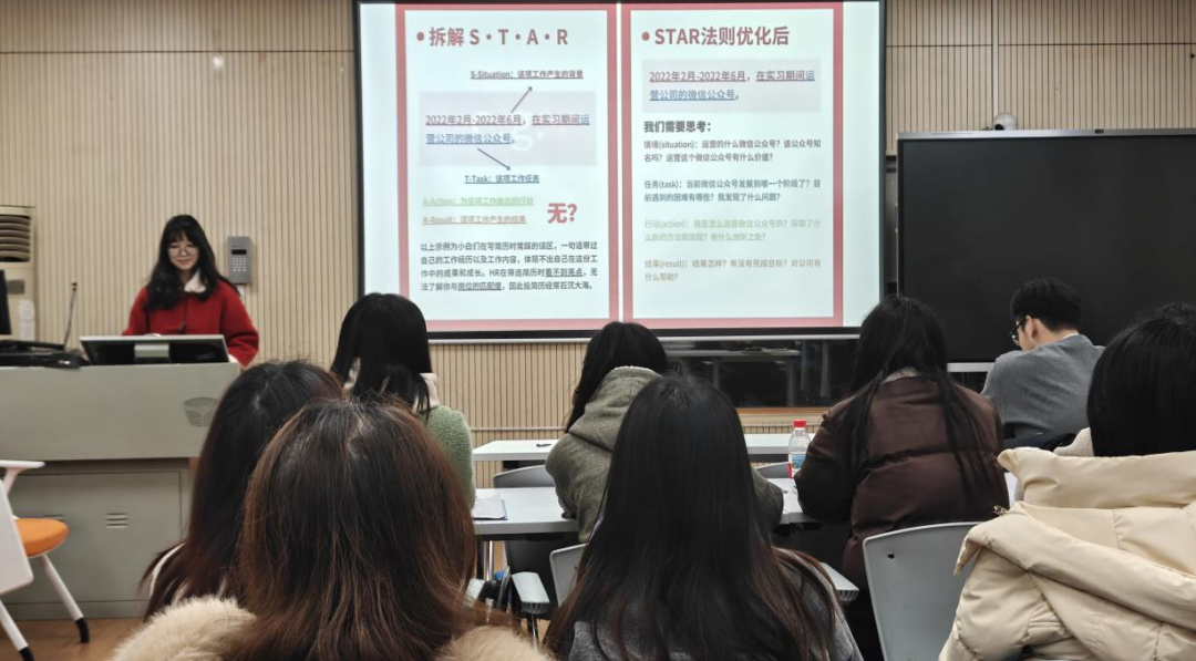 通过对三份典型简历的对比分析,陈霈源引导同学们直观感受优秀简历的撰写要点,并详细讲解了如何运用STAR法则(情境、任务、行动、结果)优化实践经历描述,使个人能力展现更加立体饱满。她特别提醒同学们:“简历不是经历的简单罗列,而是能力的精准提炼,每一段描述都应该有它的战略价值。”