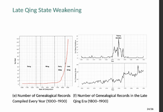 由气候变化导致的冲突就会引起古代中国国家发展的变化。唐代的网络结构可以用星状型结构来表示,因为当时的国家是由君主和士族共同统治。但到了晚唐时期,由于黄巢起义屠杀了门阀大族,导致原来的网络结构被摧毁了,因而推动了唐宋转型。由此,从宋代开始就大规模用科举考试来选拔官僚,科举把地方的乡绅精英选拔到了中央,这些地方乡绅跟唐代的那些全国性的士族是完全不一样的,这些地方乡绅有地方利益,他们只跟某个地方有很强的关系,并没有一个遍布全国的网络。所以从宋代开始中国就形成了领结型网络结构,这种领结型结构一直持续到鸦片战争爆发的时候。鸦片战争是一次影响深远的外敌入侵事件,它深刻地改变了中国国家和社会的关系,随后导致晚清出现了孔飞力(Philip Kuhn)指出的“地方社会的军事化”现象——在太平天国时期,咸丰皇帝需要地方的乡绅来组织军事组织团练用于镇压太平军,这个时期地方组织完全独立于国家的控制。杜赞奇(Prasenjit Duara)提出的“国家内卷化”也是同样一个过程。这样,晚清国家慢慢失去了对社会的控制,这种现象一直持续到1949年。这一阶段的中国都是处在这样一种指环型的网络结构当中。