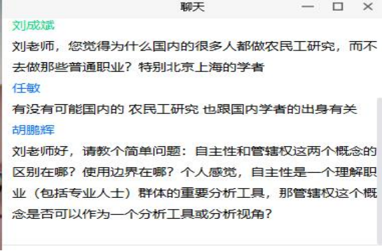 最后,刘思达老师为各位师生开拓了思路,认为职业的内部结构与外部关系两方面都是以后可以关注的领域,职业的内部社会结构可以关注学术教育、行业准入、行业协会、职业伦理等方面,职业的外部社会关系可以关注客户、国家、社区、网络对职业的影响。他针对全球劳动分工下的中国职业为大家留下了一个问题,“一带一路”对中国职业的现代化和国际化发展提出了全新的要求,企业海外投资对金融、法律、税务、传媒、教育等各个职业的需求不断提高,如何在国内国际“双循环”的基础上打破西方职业传统型权威在全球劳动分工中的垄断地位?引发师生们的思考。在总结环节,刘思达老师指出他更多的是给大家指出研究思路和研究方向而不是给出答案,希望各位师生未来都能够在职业社会学领域做出自己的贡献,为职业社会学的建设添砖加瓦。