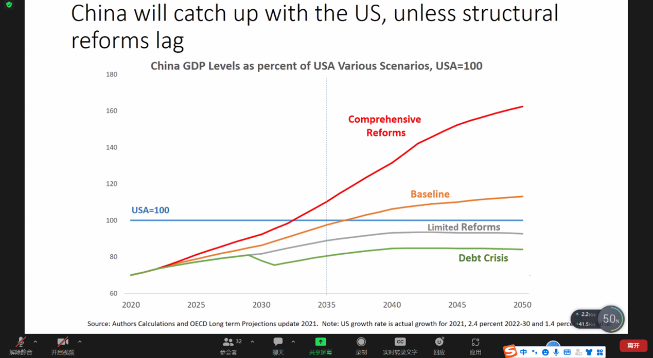 讲座中,霍夫曼教授首先介绍了中国经济自改革开放以来发展的状况。。自2000年以来,中国已经成为对全球GDP贡献最大的经济体。根据2022年的调查数据估算,中国的购买力平价已经超过美国,但是中国(2020年)的劳动力人均GDP仅为美国的四分之一。为进行进一步解释,霍夫曼教授从人口结构、人力资本、资本和全要素生产率(尤其是技术及产业结构)四方面,对推动未来中国经济增长的因素进行了深入的分析。基于此,霍夫曼教授根据一般性增长方程,提出了中国经济增长的三种可能性方案:基线方案、全面改革方案和有限改革方案。霍夫曼教授分析了各种方案下中国未来GDP的增长速度(2020年至2050年),他认为,中国如果实施全面改革方案,GDP水平将于2035年前后明显超过美国。反之,如果中国的结构性改革滞后,则会制约中国经济的赶超,陷入债务危机。