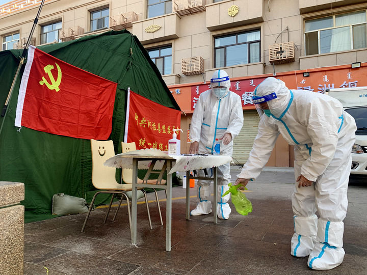 中共阿拉善盟委统战部两名党员在额济纳旗一小区执勤点消毒(2021年10月28日摄)。新华社记者 王靖 摄